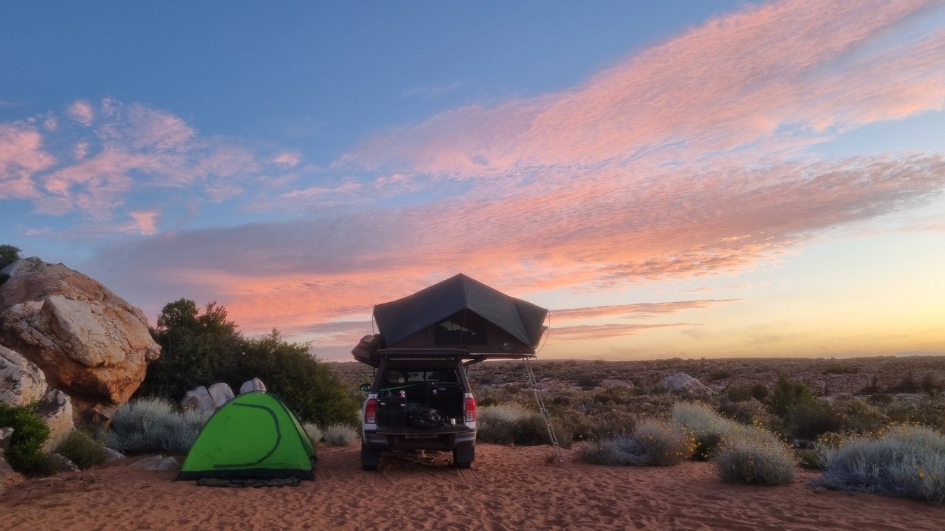 Double‑cab or SUV options with rooftop tent or ground‑tent kits, dual‑battery fridges, cookware, recovery, and spares.